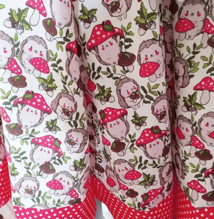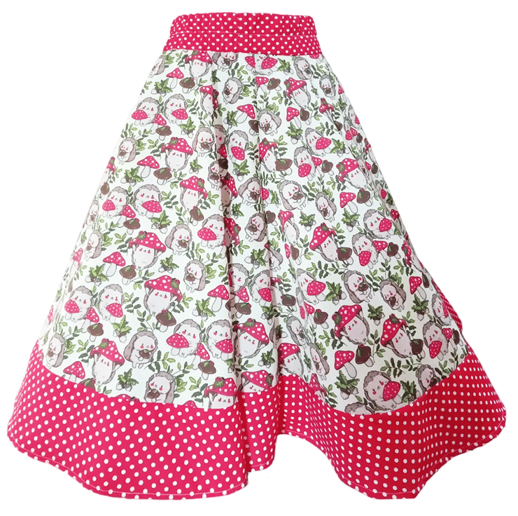 Handmade in Wales 1950s Vintage retro rockabilly full circle skirt, elasticated waist This skirt is made in a polycotton hedgehog print teamed with red polka dot polycotton. It will fit multi sizes dues to the elasticated waist. 28" Long from top of waistband