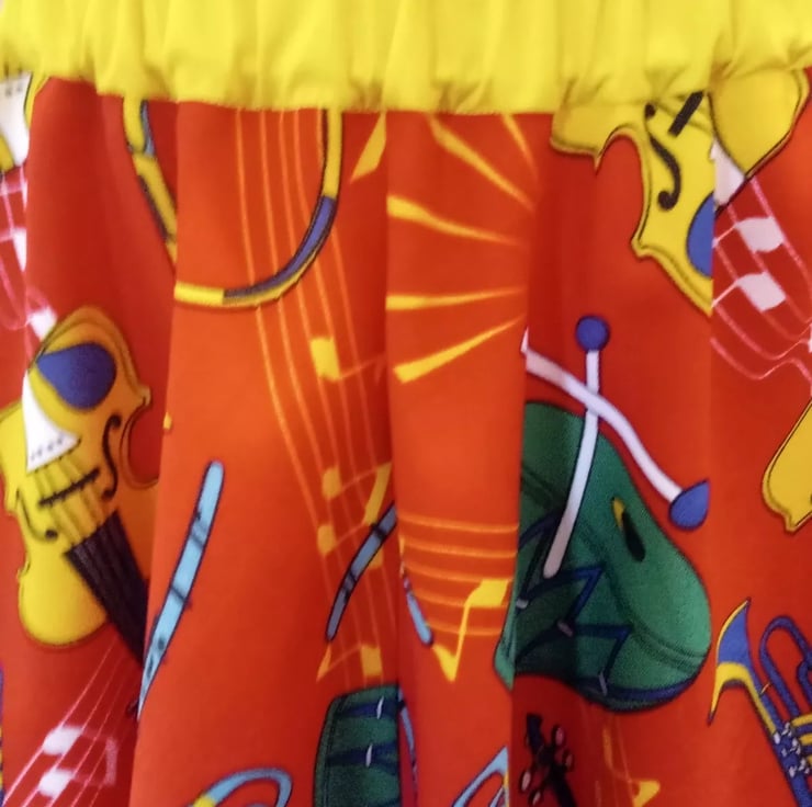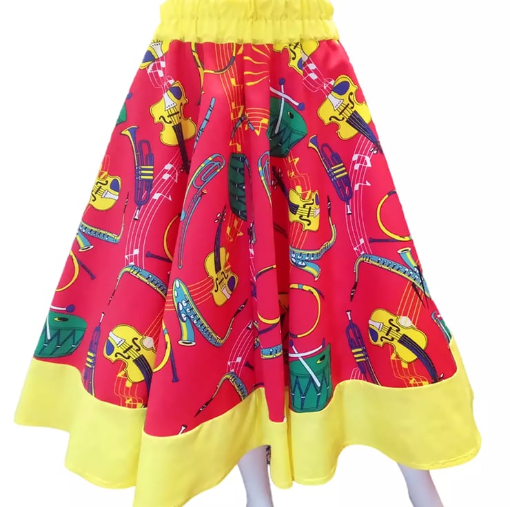 Handmade in Wales 1950s Vintage retro rockabilly full circle skirt, elasticated waist This skirt is made in a polyester musical instrument print teamed with yellow polycotton. It will fit multi sizes dues to the elasticated waist. 28" Long from top of waistband