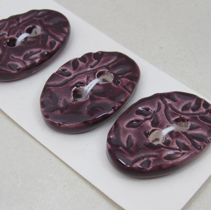 3 medium sized stoneware buttons, with a pretty leaf motif printed into the upper face. Finished with a dark aubergine purple glaze.