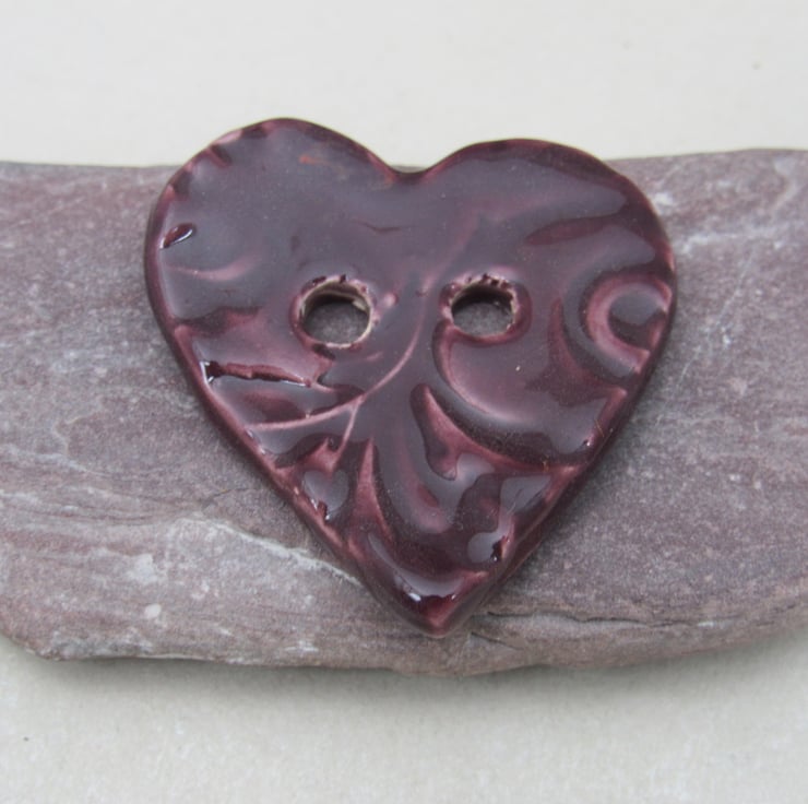 Medium heart shaped stoneware button, textured with a bold leaf and flower motif.