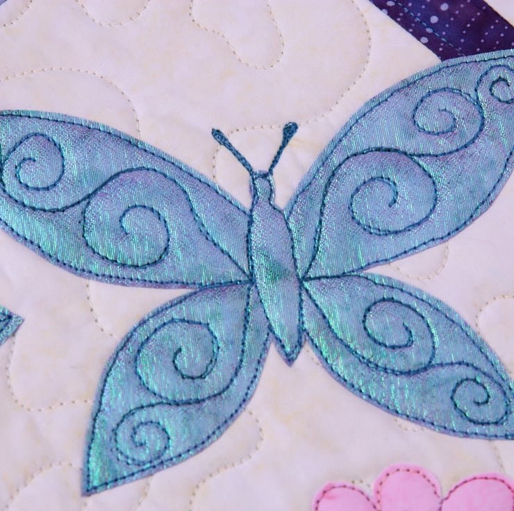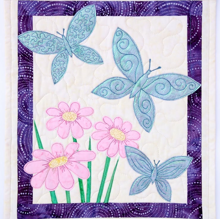 Iridescent organza butterflies flutter about pretty batik flowers.