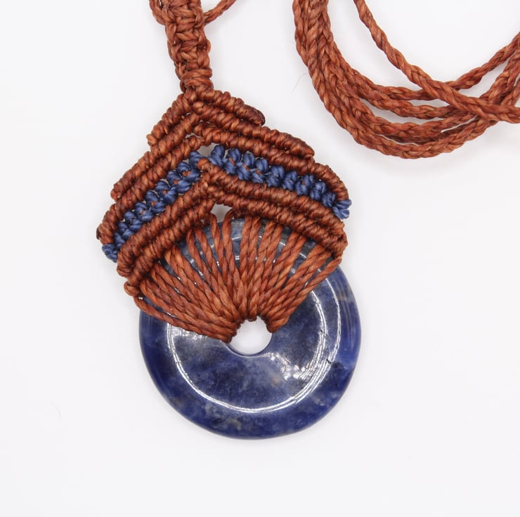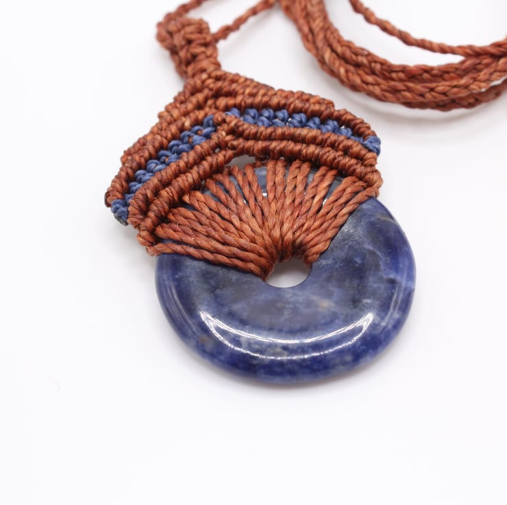 Carry the calming essence of the sea with this stunning handmade necklace. Featuring a polished sodalite ring with intricate woven macramé knots. Crafted with earthy brown cord and gorgeous blues of the Sodalite. This piece is a reminder of the gorgeous earth & sea.