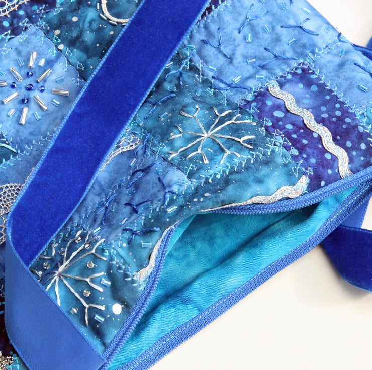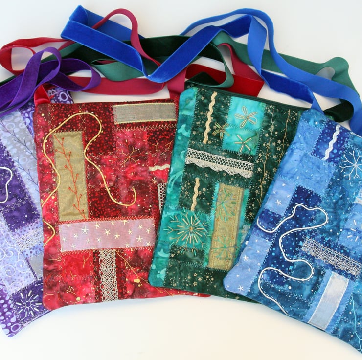 Included in the kit; batiks fabric, felt, lining fabric, glass beads, a selection of hand sewing threads, matching zip, velvet ribbon for the strap, ribbons & lace, and photo illustrated instructions.