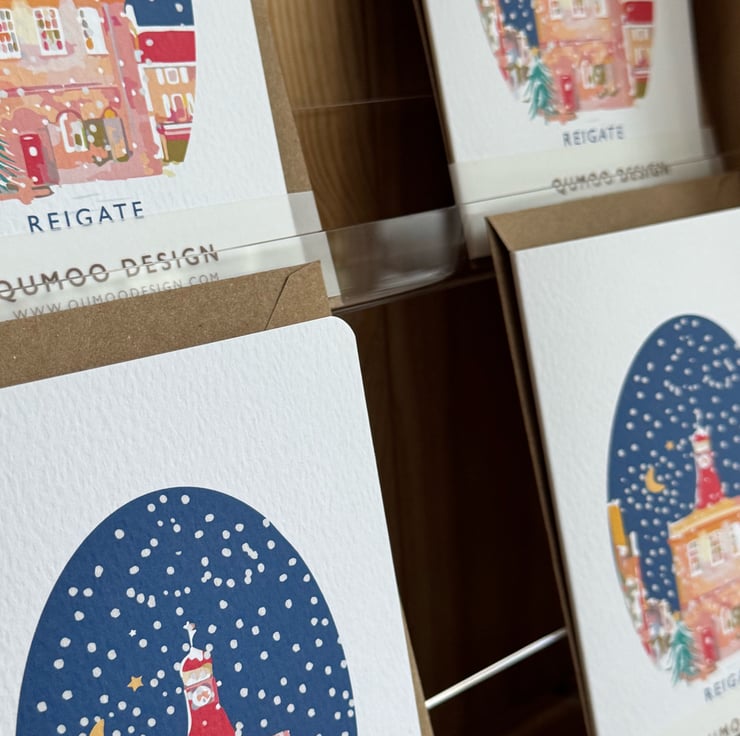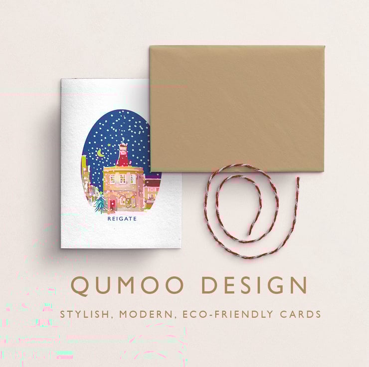 Card: Spread joy and celebrate with this stylish, blank individual A6 card with a Reigate Old Town Hall Christmas design.