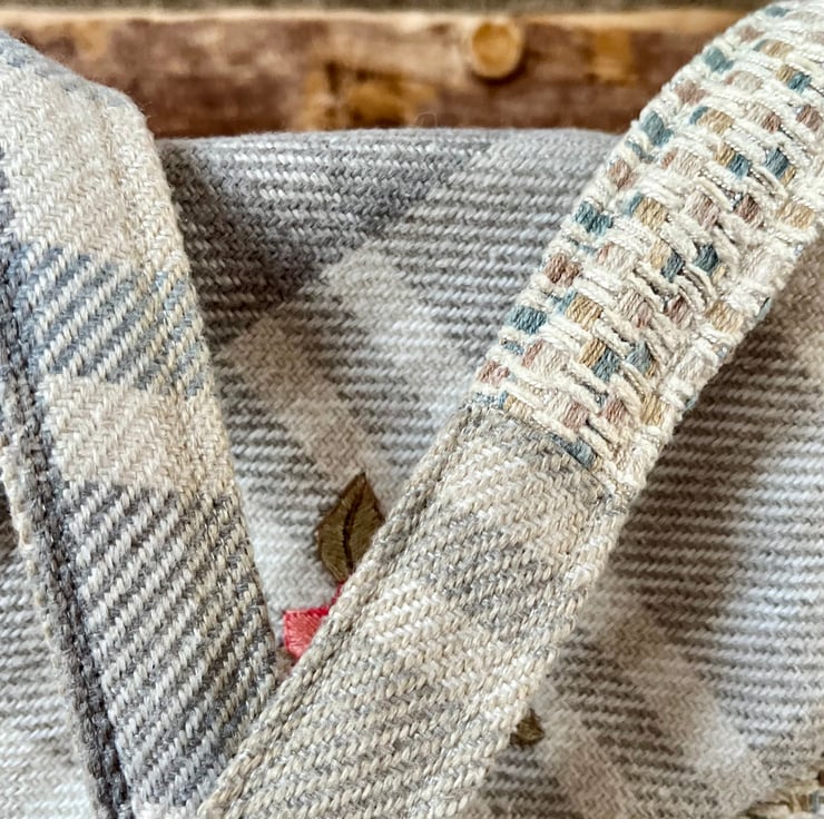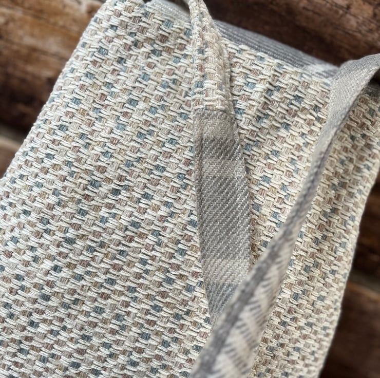 This unique messenger / crossbody bag has been upcycled from a curtain sample of a loose weave of cream with aqua and dusty pink and has been paired with another curtain sample of a light grey and cream check. Perfect for spring / summer.