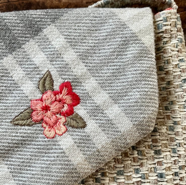 The flap has been decorated with hand embroidered flowers and leaves in shades of dusty pink.