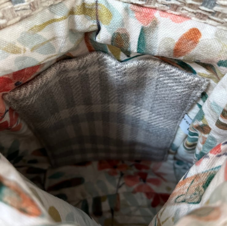 The bag is lined with a pretty floral pattern on a white background which was also a curtain sample and has an internal pocket in the check fabric.