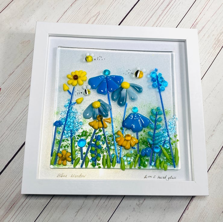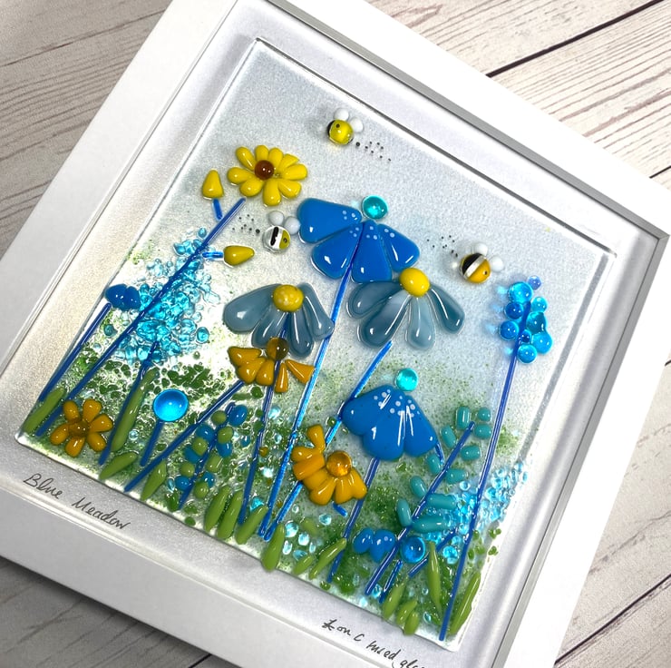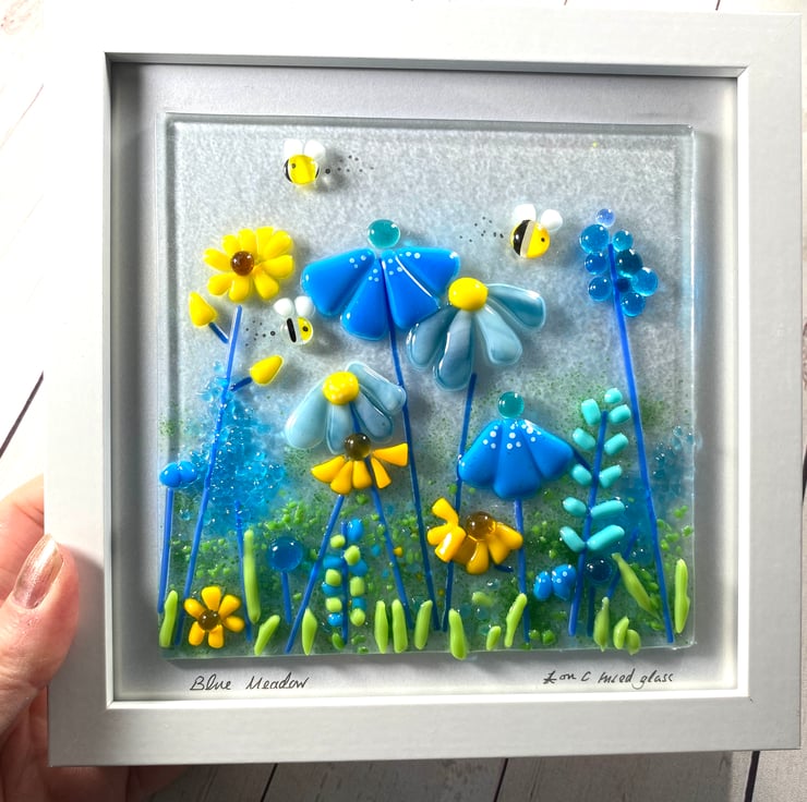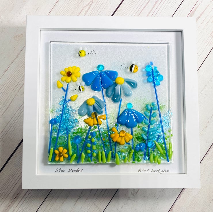 Gorgeous fused glass picture - the first in this size to complement my other pictures . Shades blue and yellow create this joyful meadow field . The modern box frame can be wall hung or free standing . Complete with hand crafted glass bumble bees . And would add light and interest to any room . The fused glass art is created over 2 firings in my home studio kiln . Each firing is approximately 24hrs . A stunning and affordable one of a kind picture. The picture including the frame is 20 cm square .