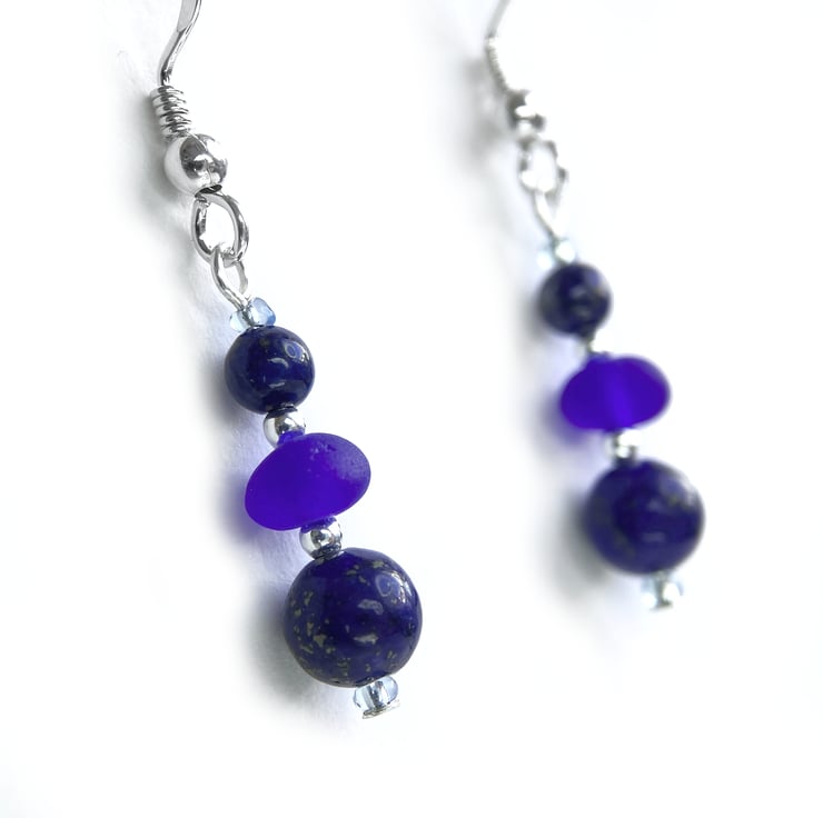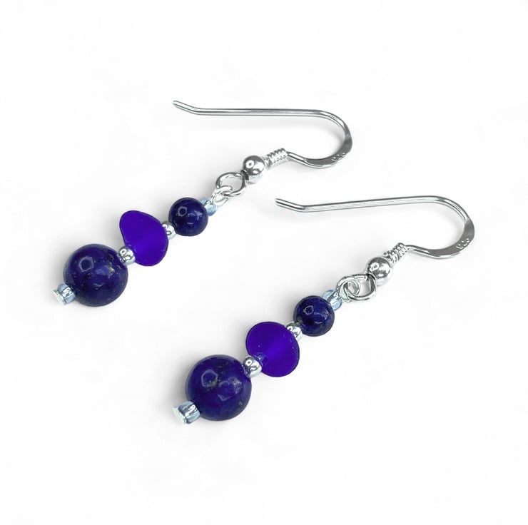 These delicate handmade earrings feature dark blue tumbled glass – smoothed to resemble the frosted finish of sea glass and paired with natural Lapis Lazuli crystals, sterling silver and Czech glass beads.