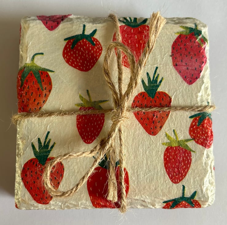 Each item is made from a slate coaster and napkin decoupage. They are finished with heatproof varnish to make them hardwearing and give them a lovely shine.