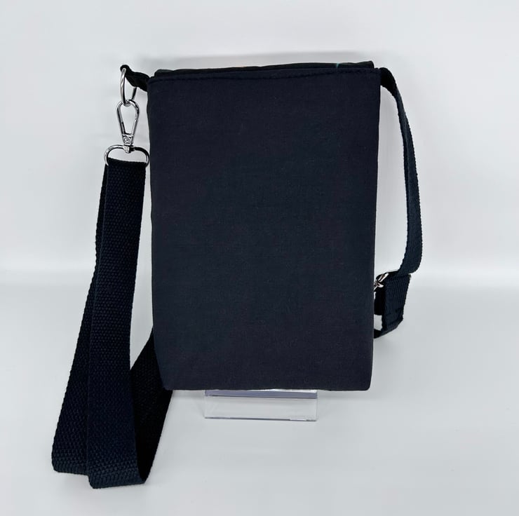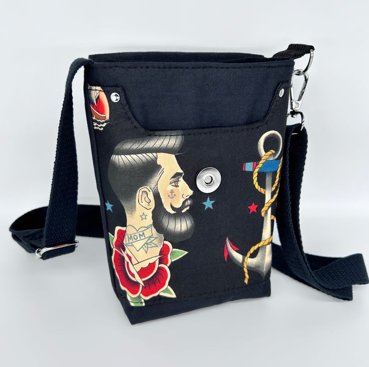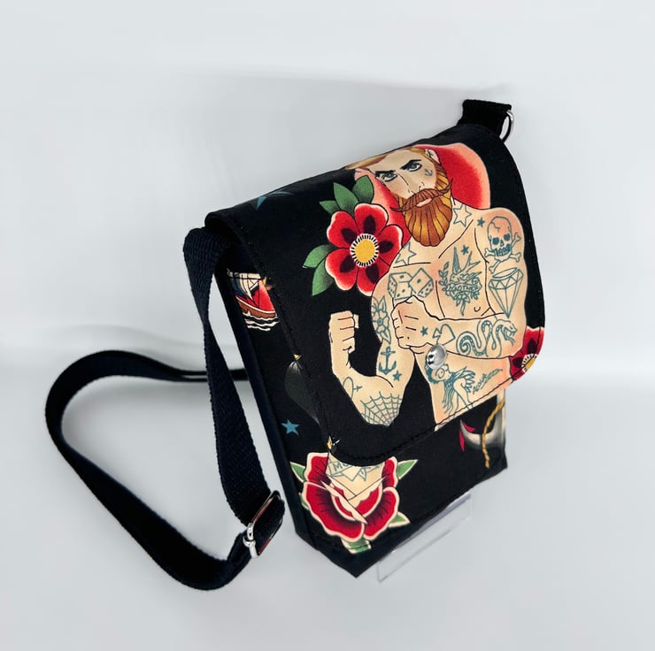 Here is a handmade tattoo style crossbody bag. All fabric is 100% cotton. There are two slip pockets, one on the front and one inside. The base of the bag is boxed making room to carry a mobile, glasses, keys, coin purse, credit cards and other small everyday items.
