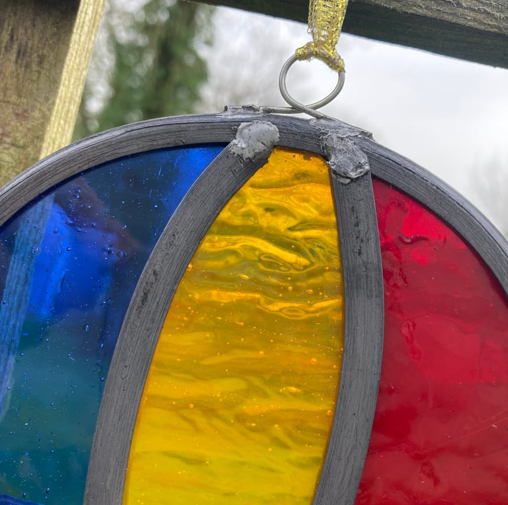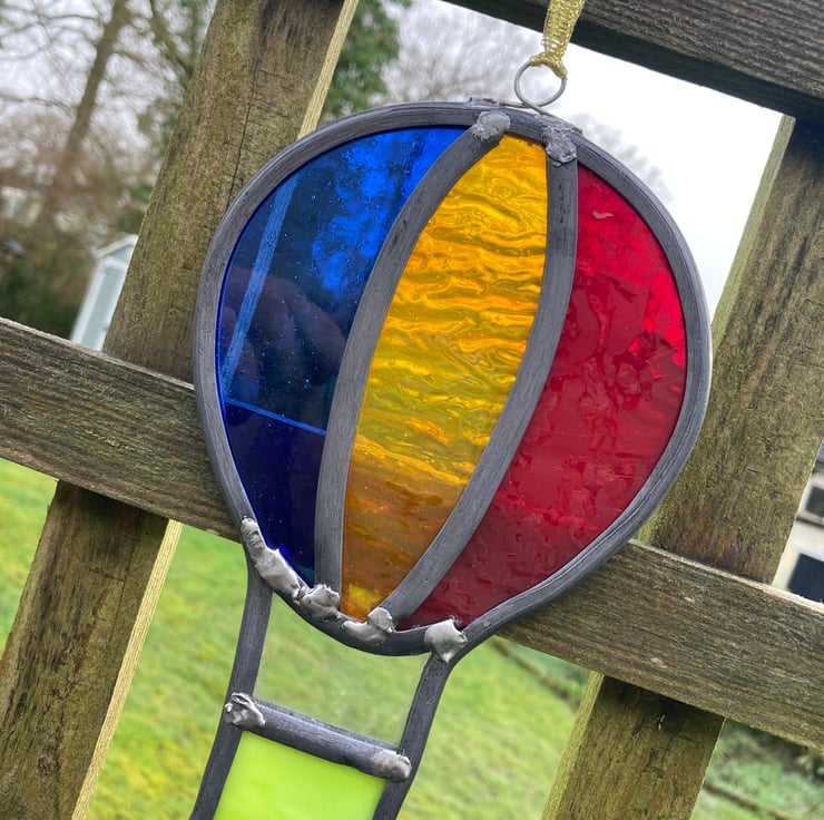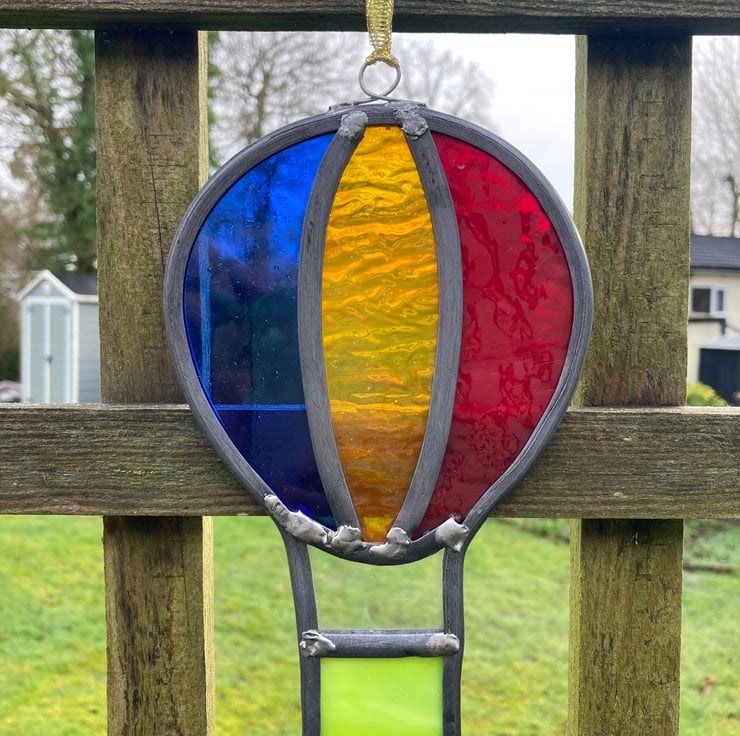 Beautiful multi-coloured stained glass air balloon hanging. Stunning with the sunshine showing through, when we get sunshine, of course! Approx 20cm x 13cm. Colour combinations vary, can send photo of any different options, it just depends on availability of glass.