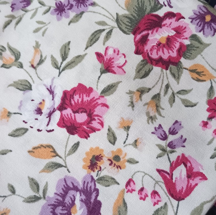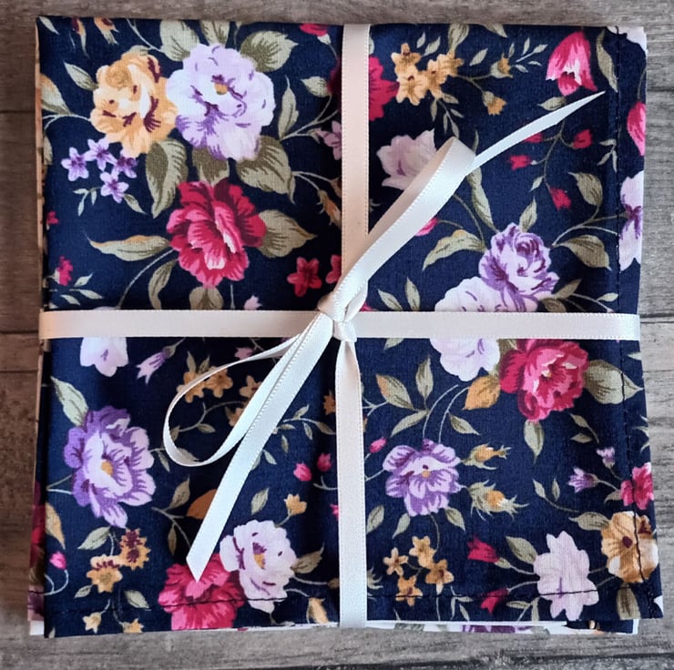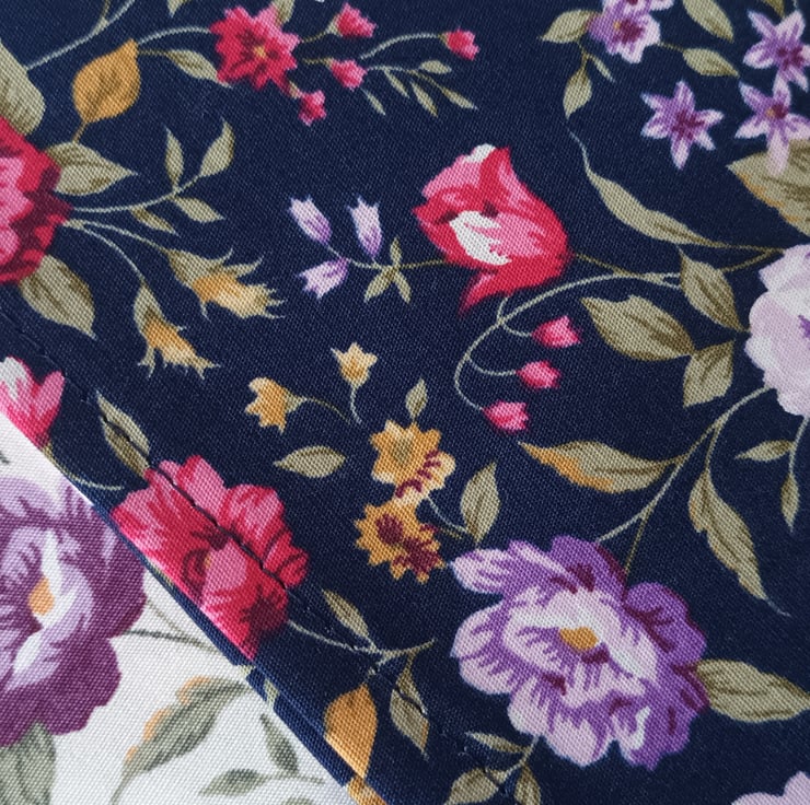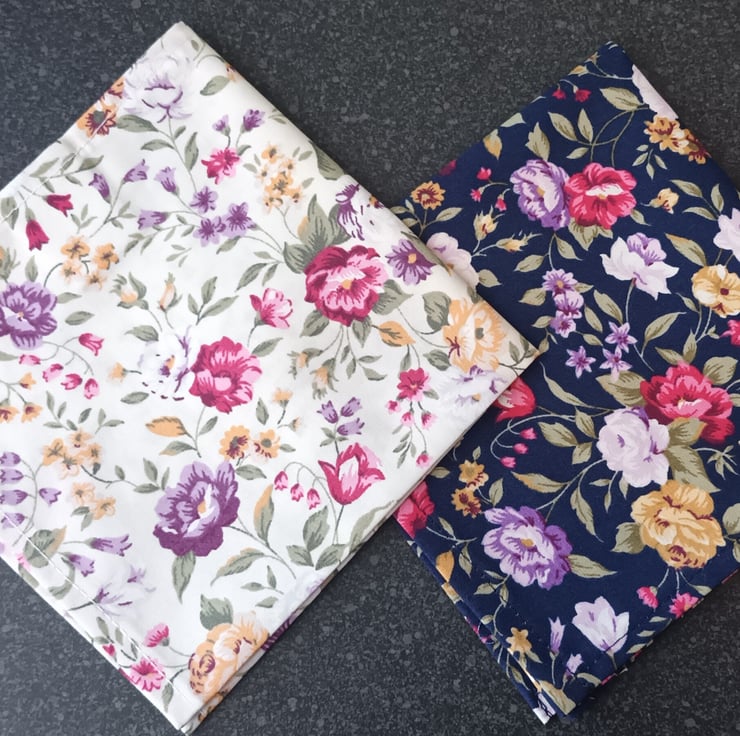 A pair of ladies, 100% soft cotton handkerchiefs. One with multi coloured flowers on an ivory cream background and one with multi coloured flowers on a deep blue background.