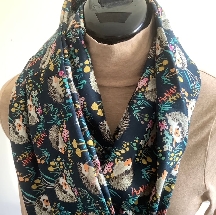 Beautifully long looped scarf to wrap infinity style around your neck to keep warm and stylish. Approximately 180cm loop to give a nice drape. Fabric is cotton dressmaking weight so not too heavy or bulky. Design is hedgehog themed.