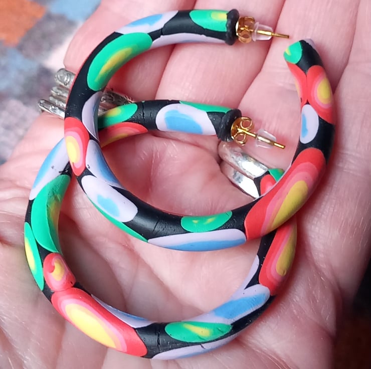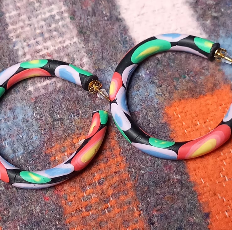Lovely polymer clay rainbow cane slab made into medium sized hoops, they are approximately 5.5 cms across.