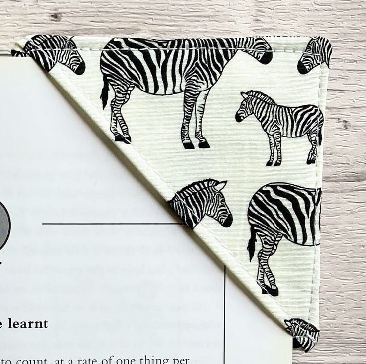 Zebra themed cotton fabric corner bookmark. Book lovers gift.