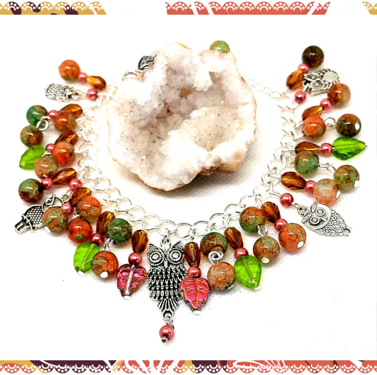 Created using these lovely Tibetan silver owl charms, crackled, marbled drawbench beads, faceted teardrops with Czech glass leaves.