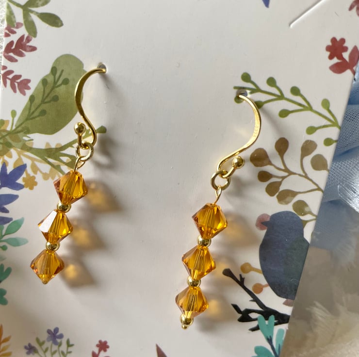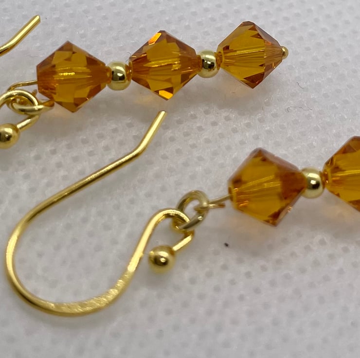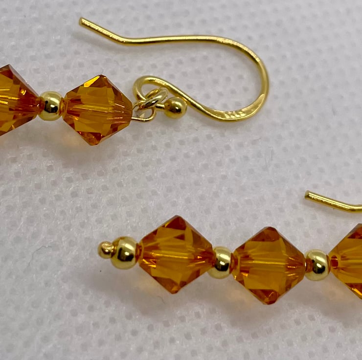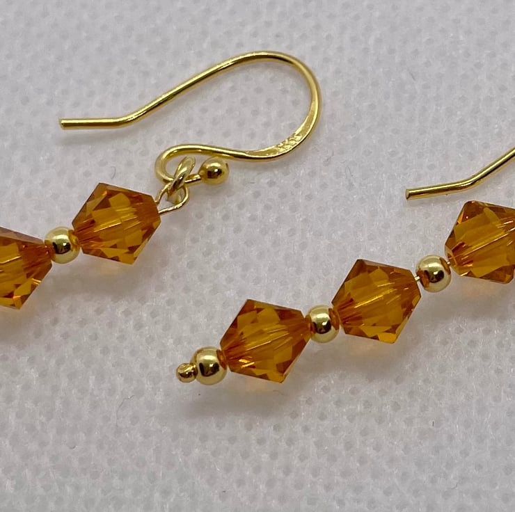 Gorgeous Swarovski light topaz coloured crystal bicone dangle earrings with vermeil gold spacer beads and gold vermeil french hooks.