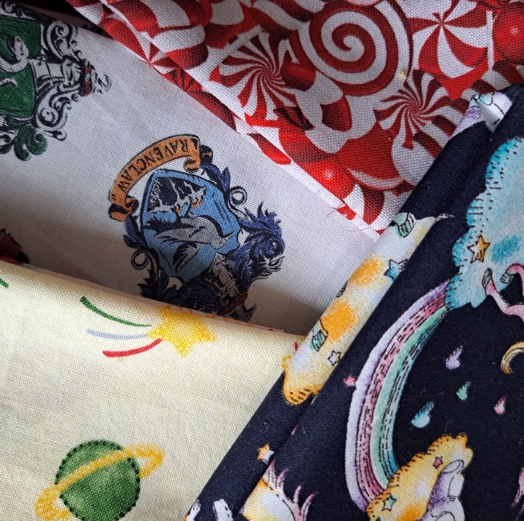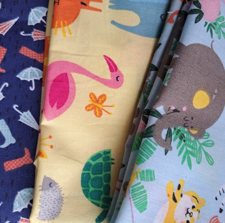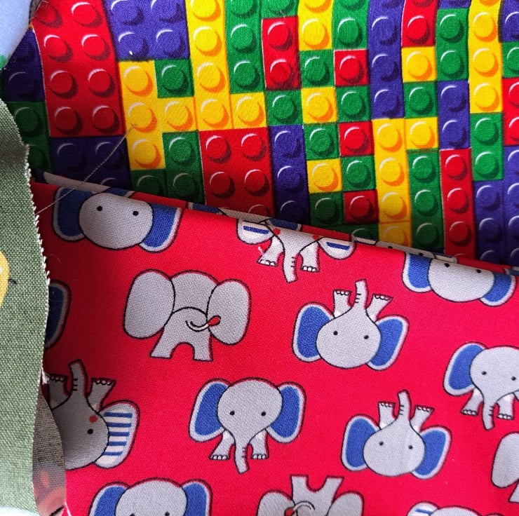 Ten pieces of cotton fabric (two might be polycotton, to be fair) with a theme of toys/games/childhood. Various sizes, the largest being 90cm by 30cm.