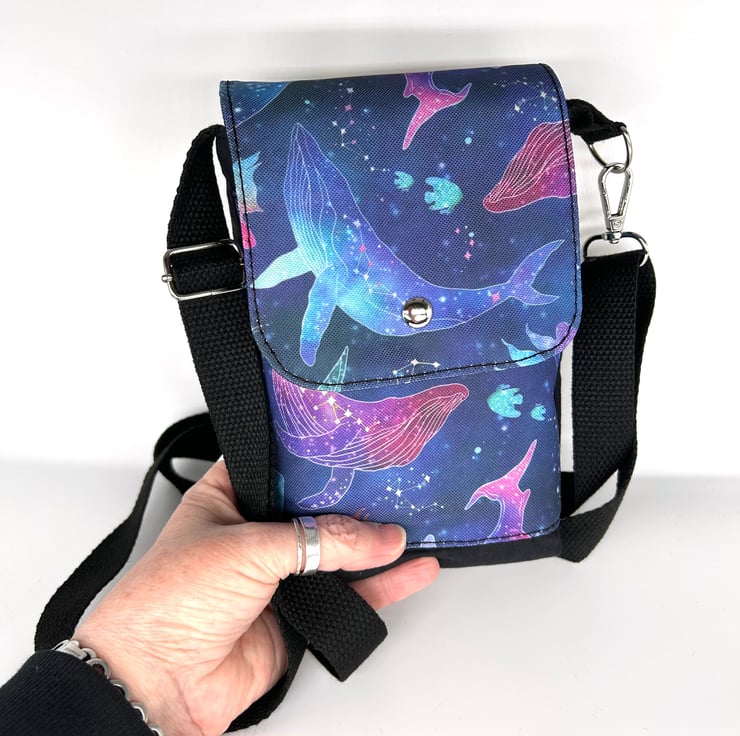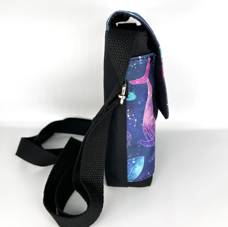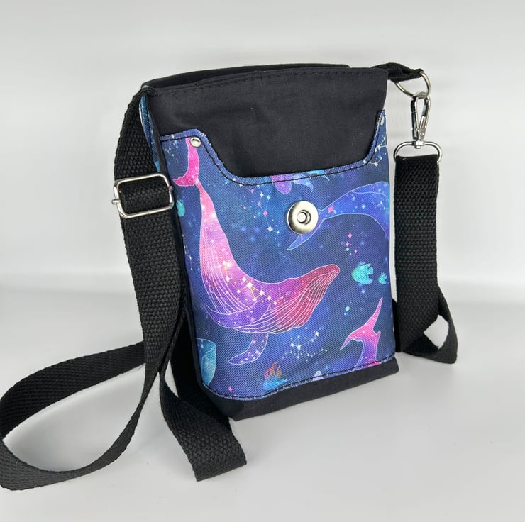 Whale print crossbody bag with constellation print on waterproof fabric. The bag is lined with black cotton fabric. There are two slip pockets, one on the front and one inside along with the main bag compartment which is boxed making room to carry a mobile, glasses, keys, coin purse, credit cards and other small everyday items.