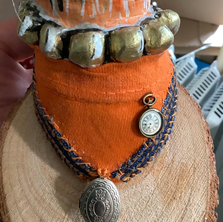 Mr Cat wears a small decorative pocket watch and a little locket - you could put a photo in it!