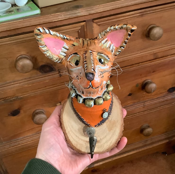 This papier-mâché cat sculpture has been made and decorated by hand. It’s is a real ‘one of a kind’ piece. I have mounted him on a wooden plaque with a hook attached.