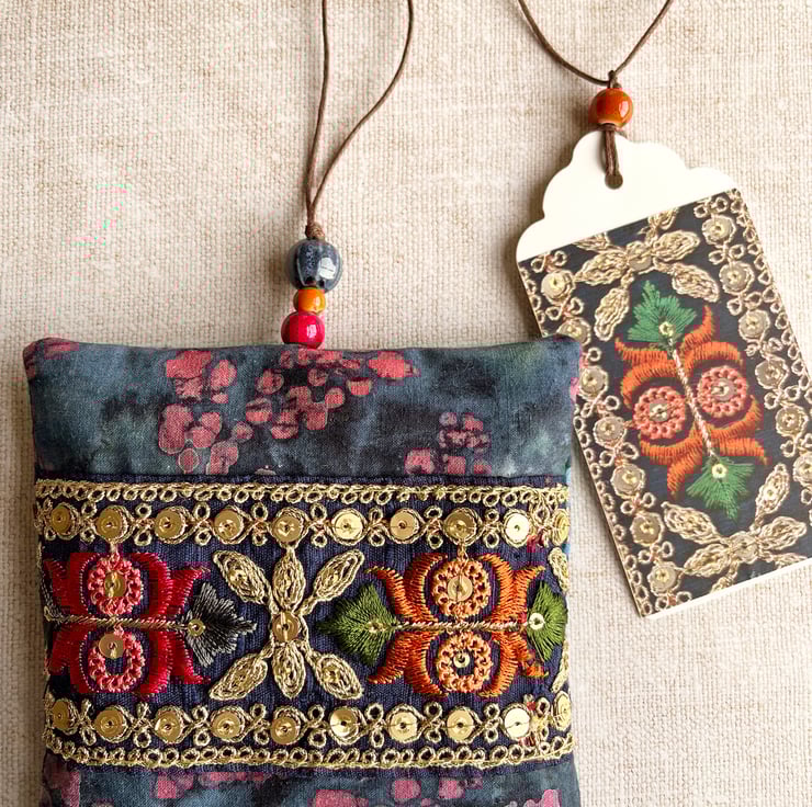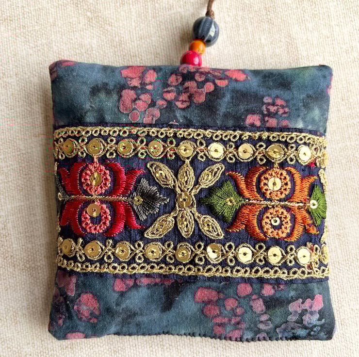 The lavender bag has been made with a pretty batik fabric in shades of blue and purple. It's filled with dried lavender from Provence and decorated with a section of embroidered Indian trim which I've hand stitched onto the fabric. The trim has metallic gold threads and sequins which gives it a lovely shimmer. I've added a few matching ceramic and glass beads to the hanging loop.