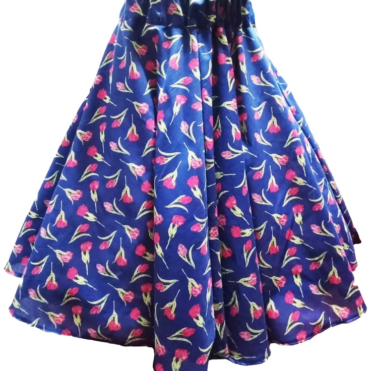 Handmade in Wales 1950s Vintage retro rockabilly full circle skirt, elasticated waist This skirt is made in a polycotton tulips print. It will fit multi sizes dues to the elasticated waist. 28" Long from top of waistband