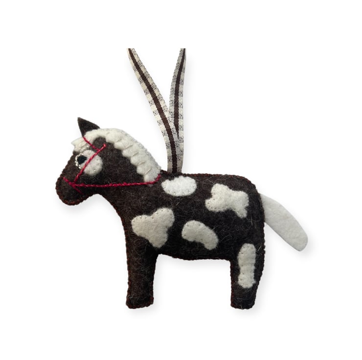 Designed and made by me using completely natural products, namely, 100% wool felt , pure wool , fleece stuffing and DMC cotton embroidery thread, this ornament features cream felt mane and tail and appliqued cream patches , making him a truly 'painted pony !'