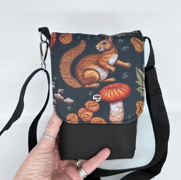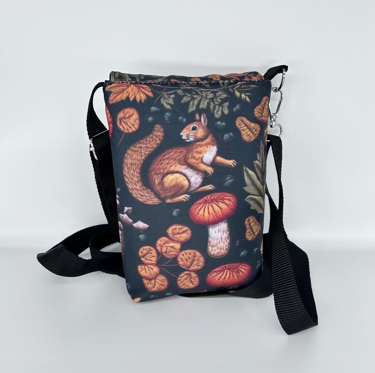 Mini cross body bag with squirrel and mushroom print on waterproof canvas.