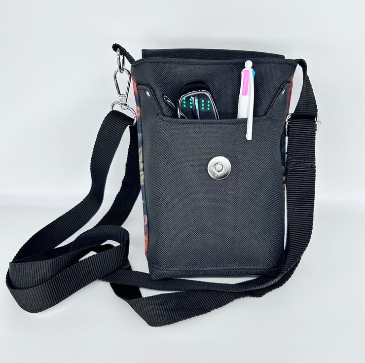 Small crossbody bag with squirrels and mushrooms print waterproof canvas fabric. The rest of the bag is black waterproof canvas and lined with black wipeable fabric. There are two slip pockets, one on the front and one inside along with the main bag compartment which is boxed making room to carry a mobile, glasses, keys, coin purse, credit cards and other small everyday items. The bag measures 7.5" (19 cms) X 6" (14 cms) X 2" (5 cms).