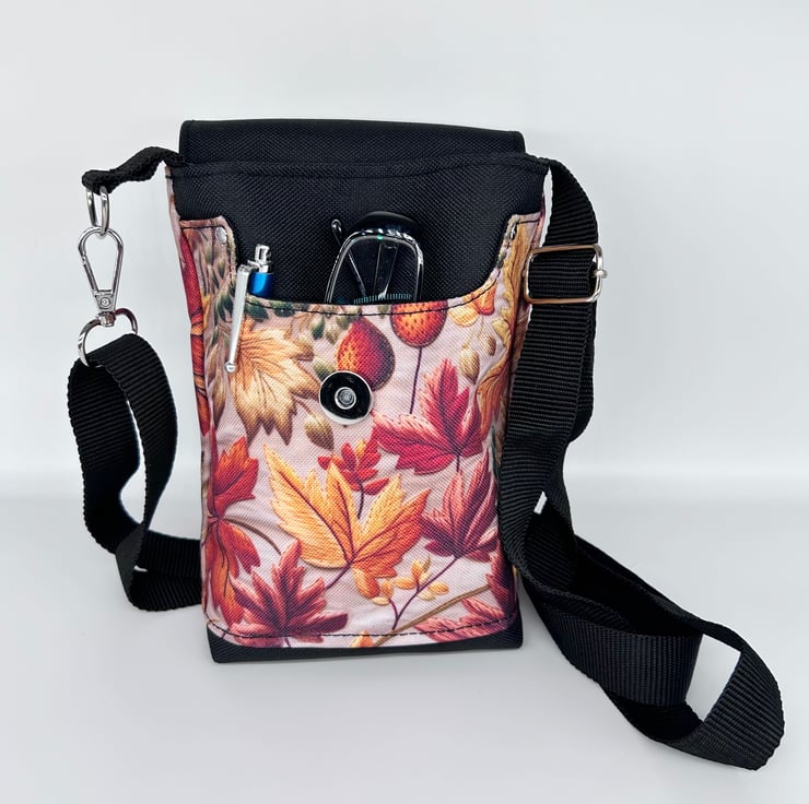 This cross body bag features waterproof canvas with autumn leaves. The rest of the bag is made and lined with black cotton fabric. There are two slip pockets, one on the front and one inside along with the main bag compartment which is boxed making room to carry a mobile, glasses, keys, coin purse, credit cards and other small everyday items.