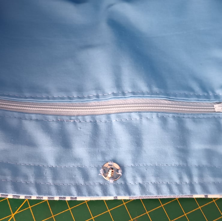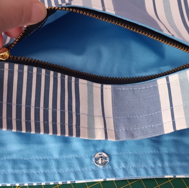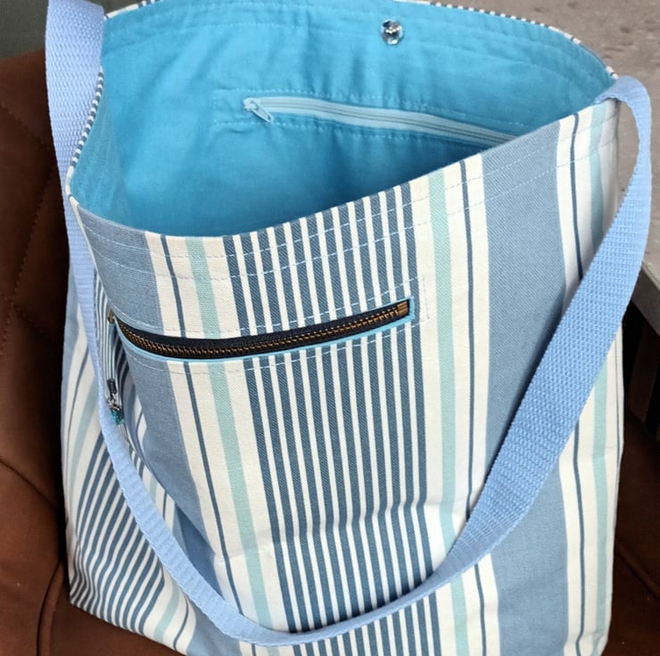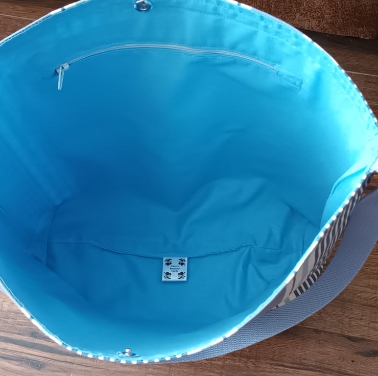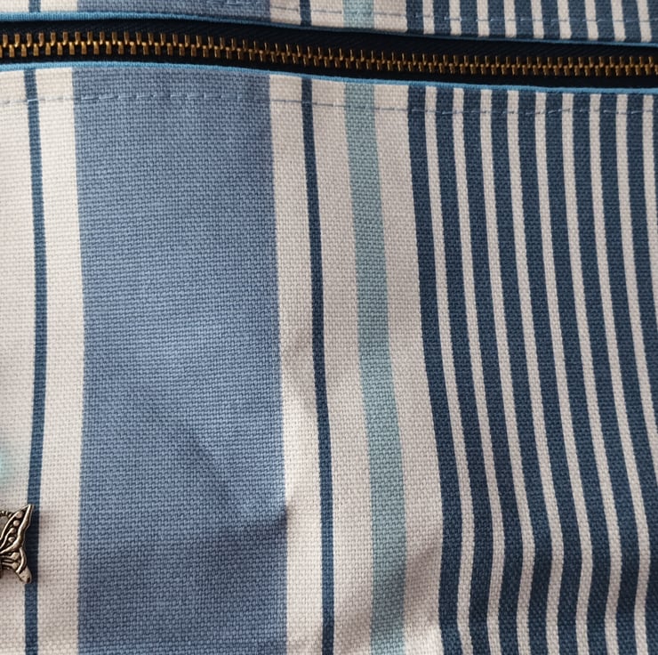 A lovely strong shoulder tote bag with press stud fastening and an inner zipped pocket, there is also an outer pocket with metal zipper and butterfly bag charm. Light blue lining inside. The striped bag has strong webbed cotton strap handles. The fabric is 100% cotton canvas to the outside and 100% light blue cotton inside.