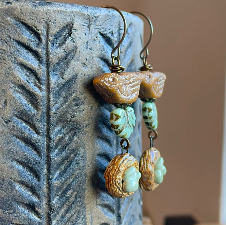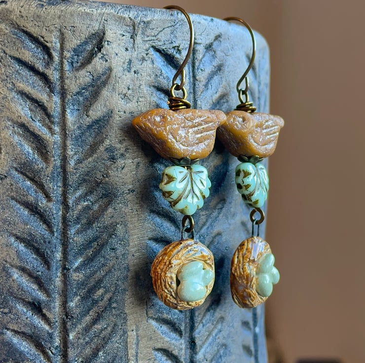 The earrings are finished with ceramic bird nest charms, which have been beautifully crafted by bead artist Petra Carpreau, and add the perfect finishing touch to these whimsical earrings!
