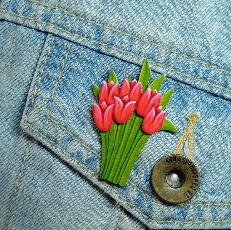 Tulip Gift, Handmade Tulips Brooch Pin, Red Tulip Bouquet, Painted Flowers Badge