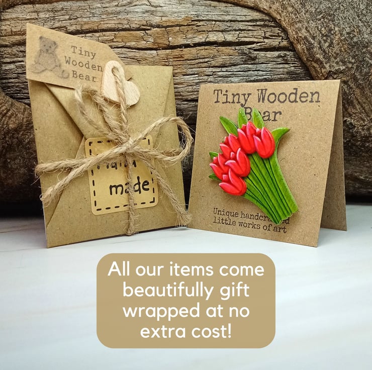 This charming hand-painted red tulip bouquet brooch is crafted from two layers of wood, creating a beautiful 3D effect. It's lightweight enough to wear on delicate fabrics while remaining durable enough to be a cherished keepsake. A perfect gift for a loved one, the red tulip symbolises love, making this brooch an especially meaningful gesture. For an extra personal touch, you can even have the back painted with a name, date, or special message. It's not just a brooch, but a lasting memory to treasure!