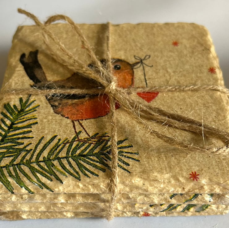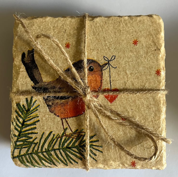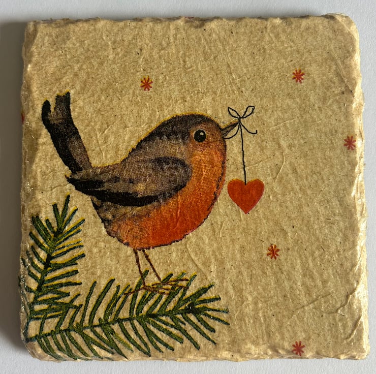 Each item is made from a slate coaster and napkin decoupage. They are finished with heatproof varnish to make them hardwearing and give them a lovely shine.