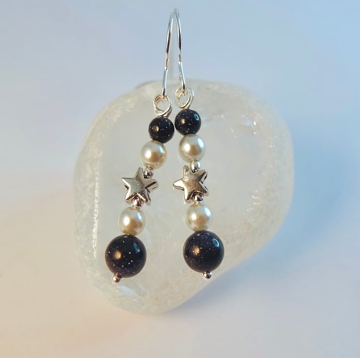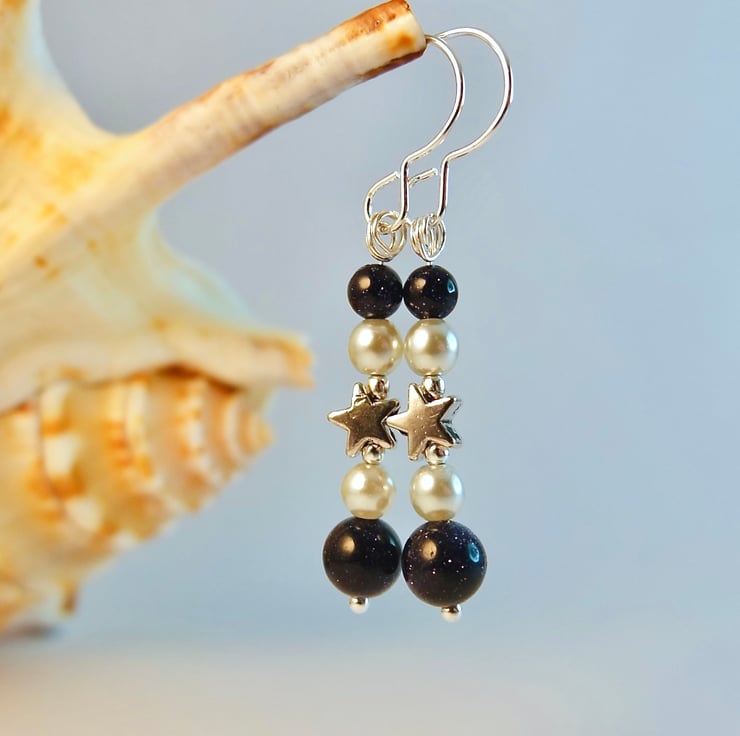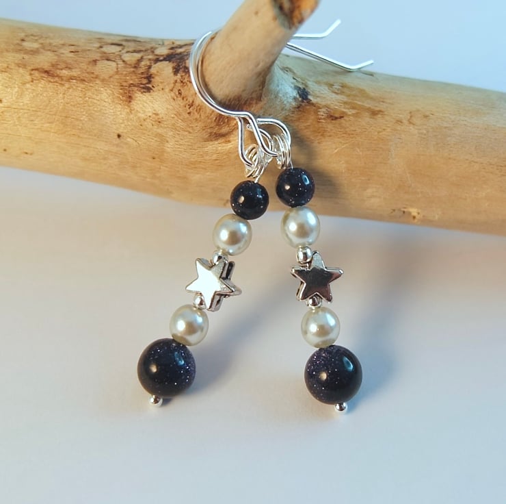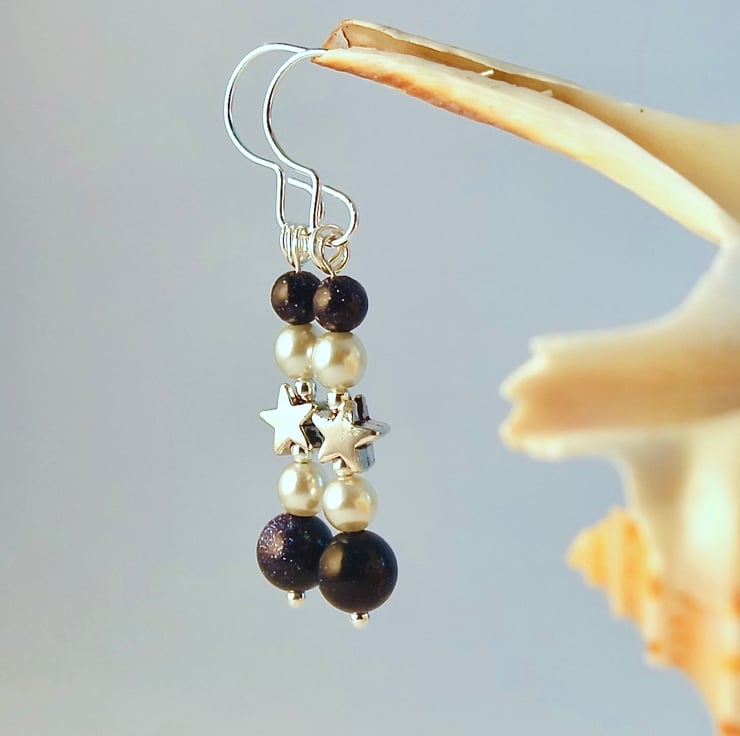 Dainty earrings, each one made from a 6mm & 4mm Blue Goldstone, 4mm pale blue Czech glass Pearls and 5mm Tibetan silver star.