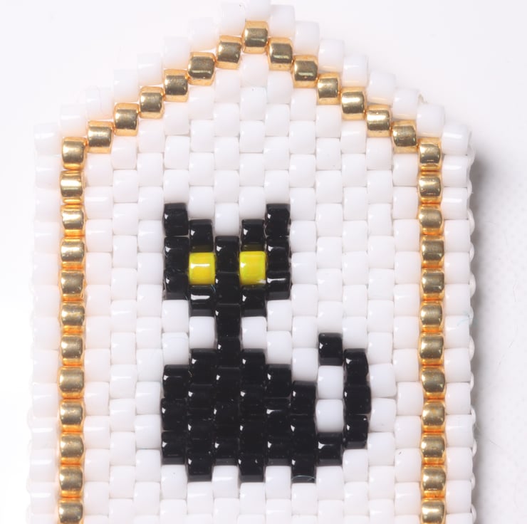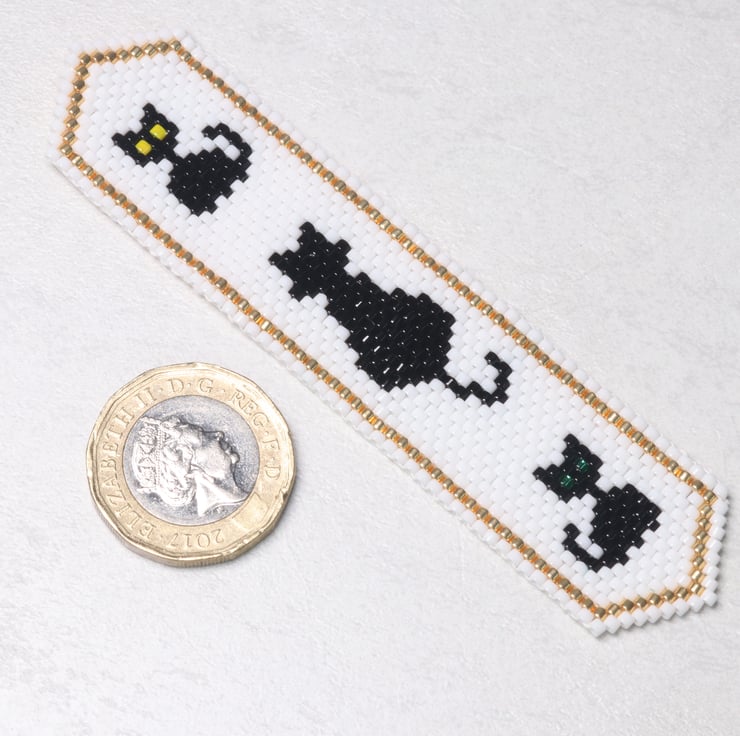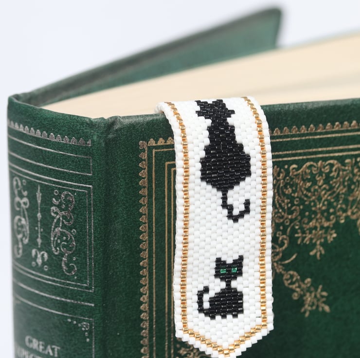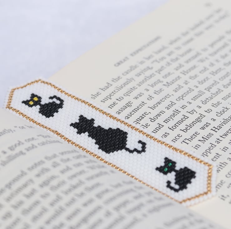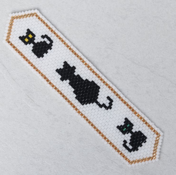 The bookmark is beadwoven, made from glass delica seed beads which have been stitched together. The pattern is double sided so that it looks the same on both sides. The design is my own: three black cats, an adult with its back to you and two cheeky little kittens on a white background with a gold border. I have not stiffened the beadwork at all, so the bookmark is fairly flexible.