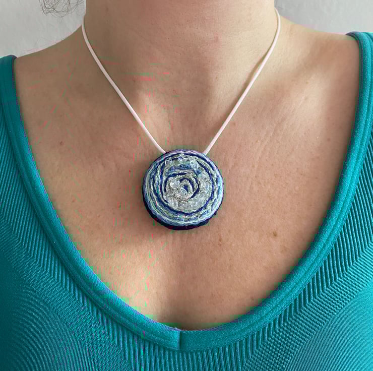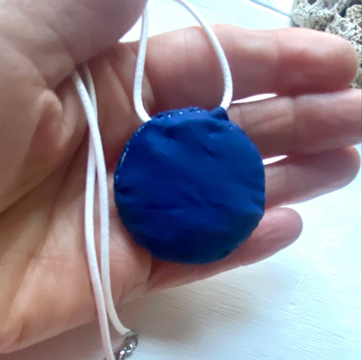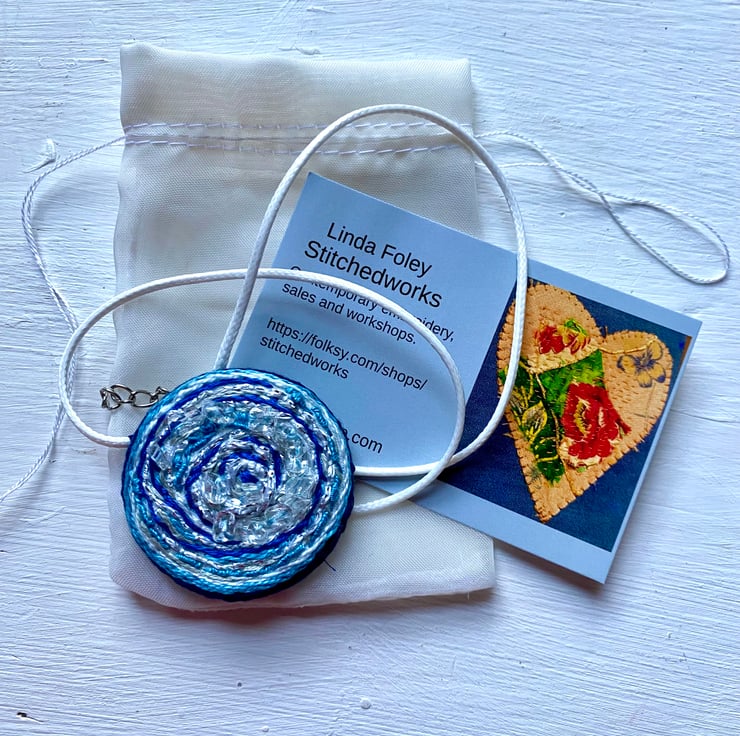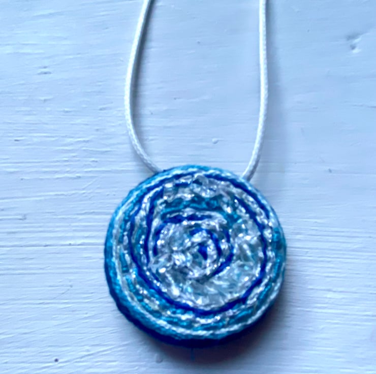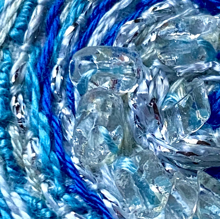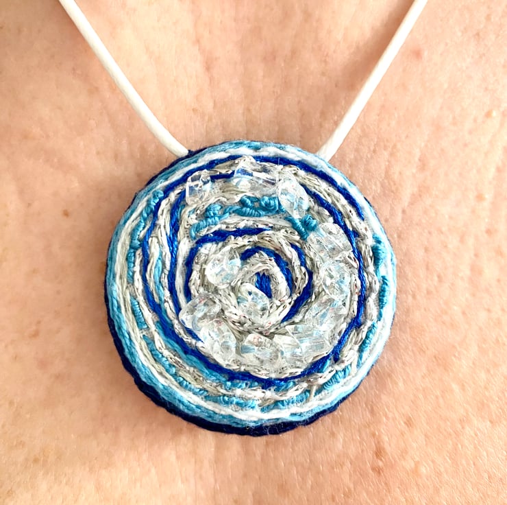 Hand embroidered in sea blues with little clear beads. This looks great with whites navy and denims. The embroidery is stretched around a repurposed plastic disc, insuring it holds its shape.