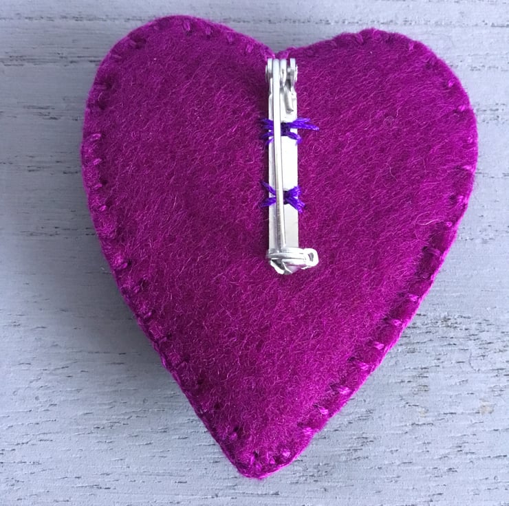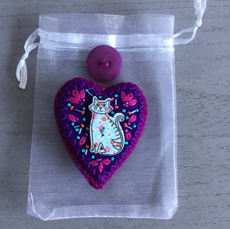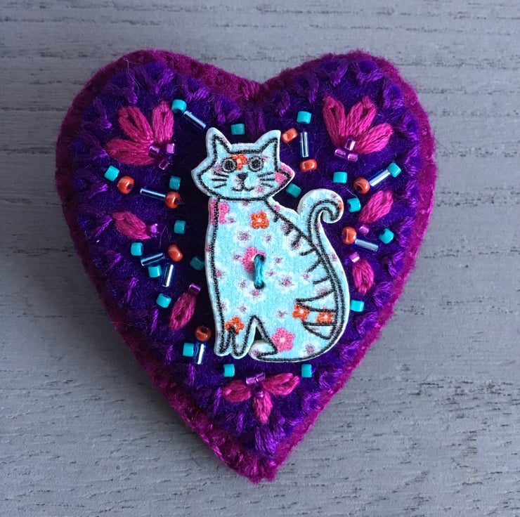 This heart shaped Hand Embroidered Cat Brooch has a wooden pale blue floral Cat Button sewn onto two felt heart shapes, in amethyst and dark pink colours. She is surrounded by hand embroidered Lazy Daisy Stitches in dark pink embroidery thread, with pale blue, turquoise and red seed and bugle beads, matching the flowers on the floral Cat Button. This brooch is edged in dark pink Blanket Stitches.
