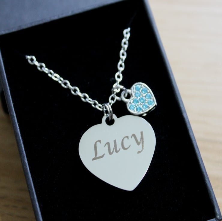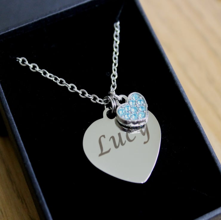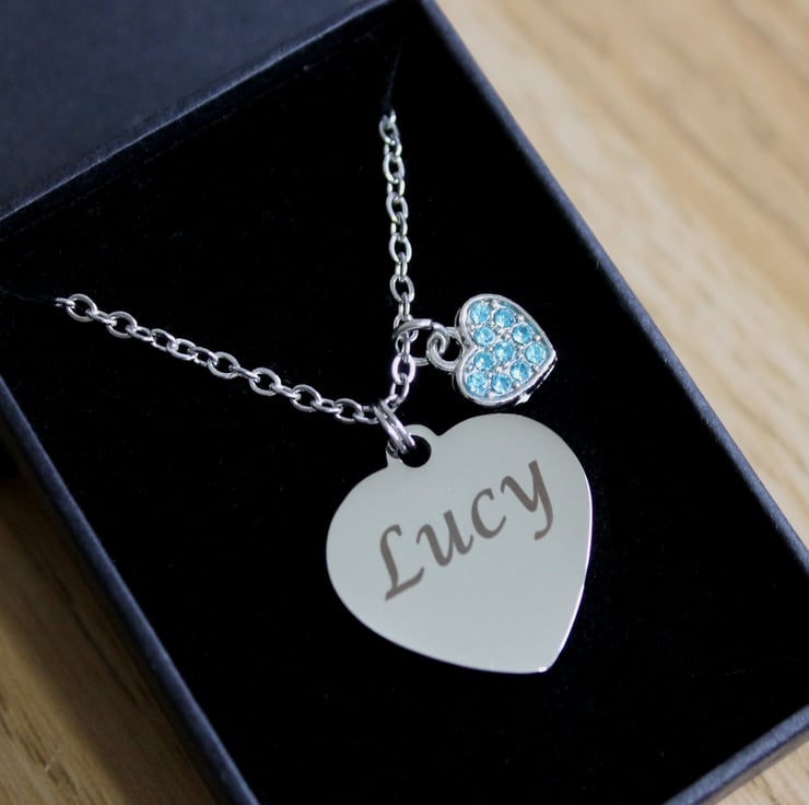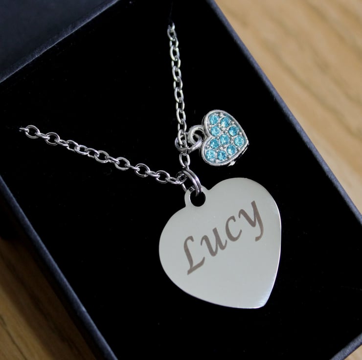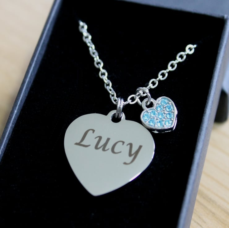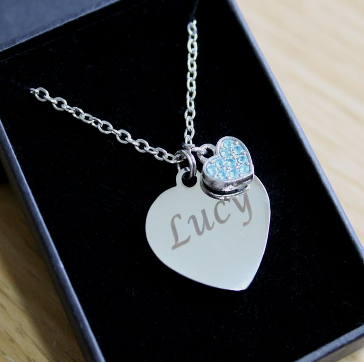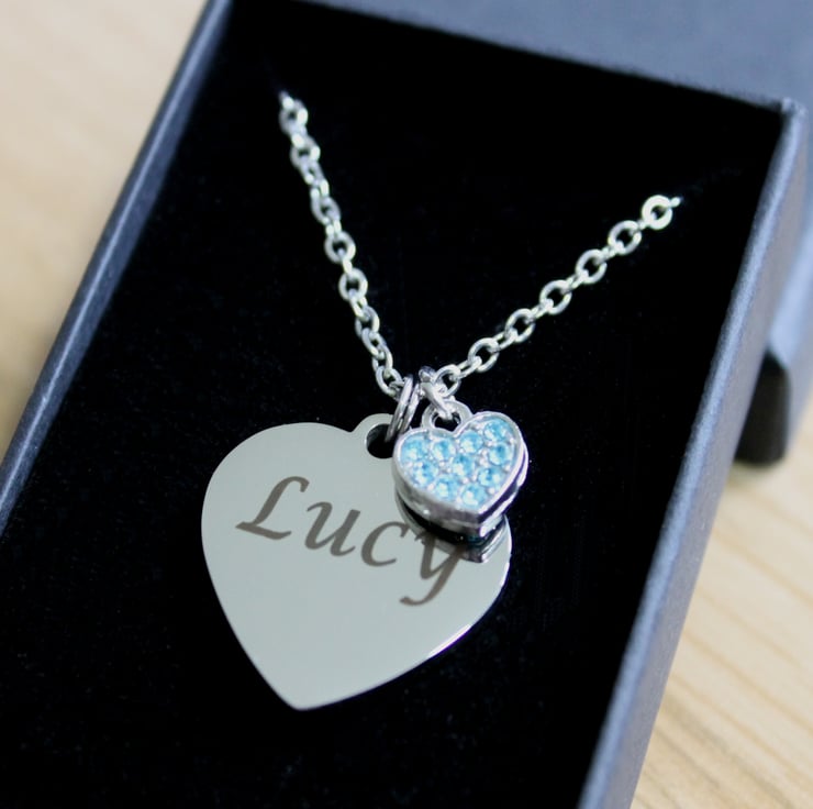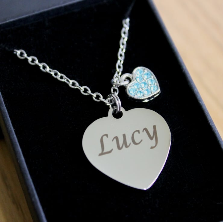 Personalised ENGRAVED Necklace, with a bue rhinestone heart