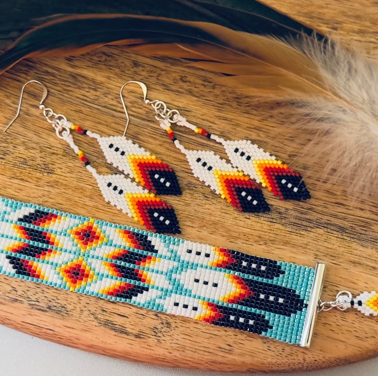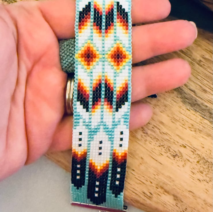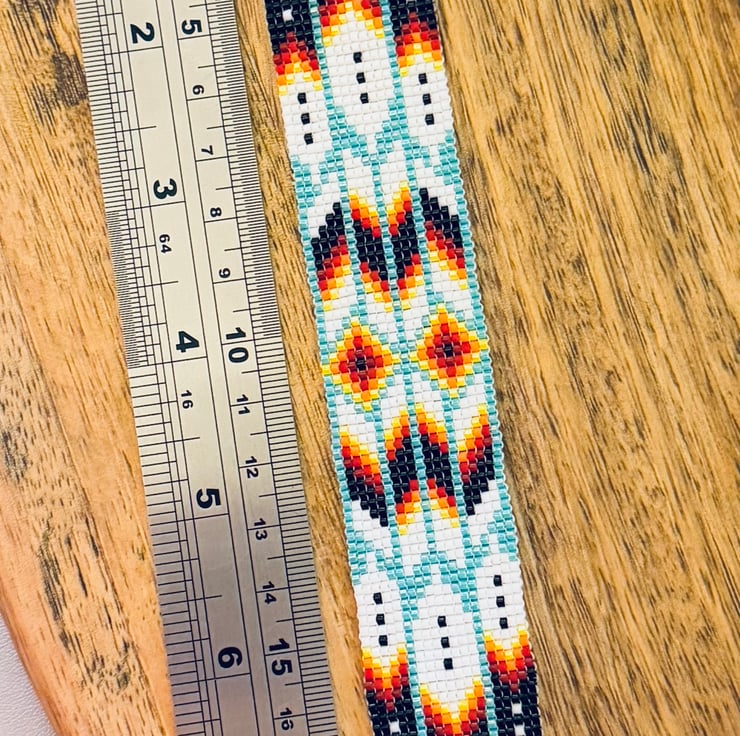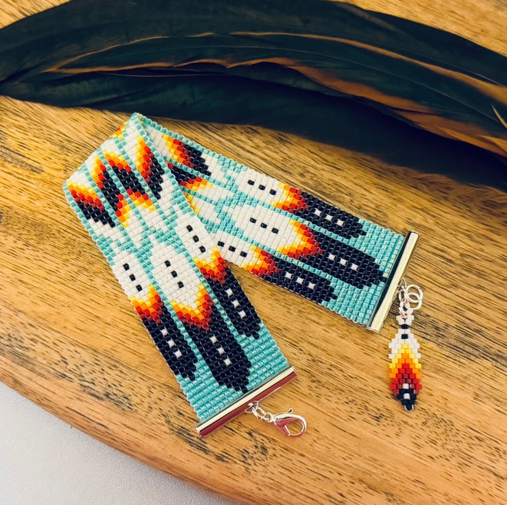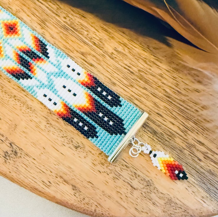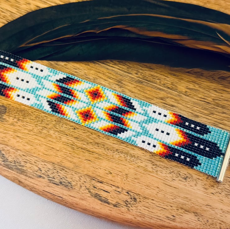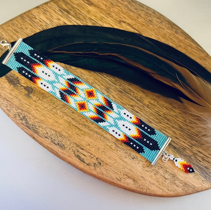 Handmade bracelet in a beautiful and colourful Native American style pattern. The design is made up of feathers and patterns in Southwestern inspired black, white, red, orange and yellow shades.