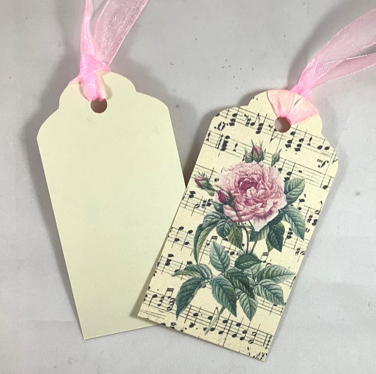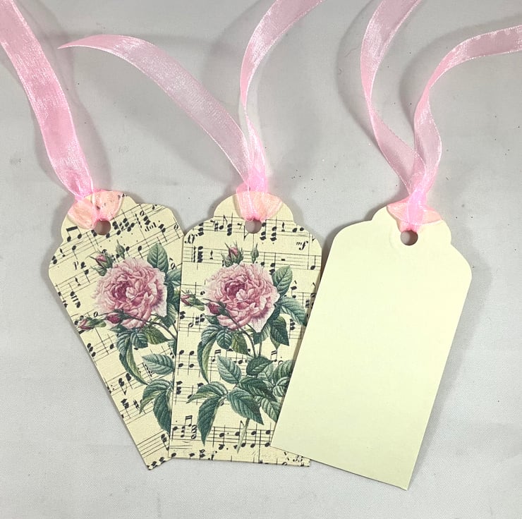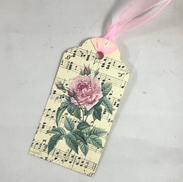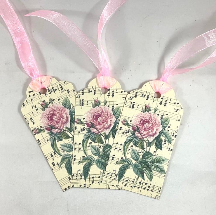 Pack of 3 gift tags featuring a vintage rose overlaid on music score and printed onto cream linen card. A length of pink organza ribbon has been added to attach the tag to your gift.