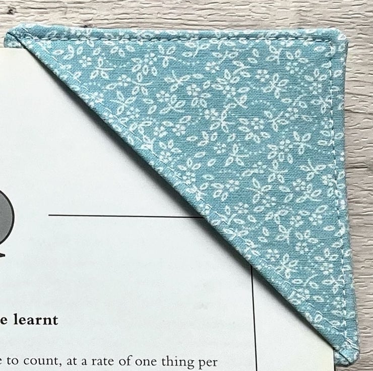 Duck egg ditsy floral cotton fabric corner bookmark. Book lovers gift.