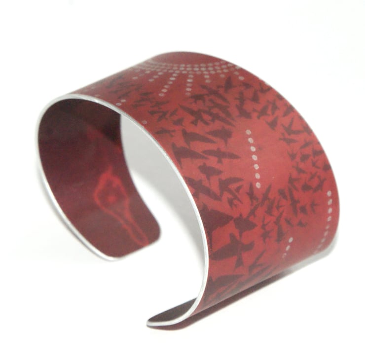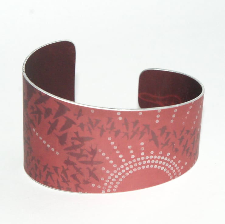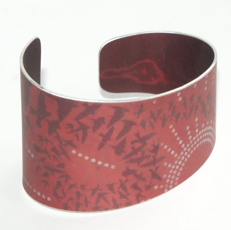 A gorgeous scandi inspired cuff bracelet crafted from anodised aluminium. The pattern originated from a sketch that I transferred to my computer to create resists. These are applied to the metal and then the piece is immersion dyed to create the layers of colour. It is then sealed and finished using traditional metalworking techniques. The cuff is wide at one end (approx 5cm) and narrow at the other (approx 2cm) creating a sculptural form that looks great on and off.