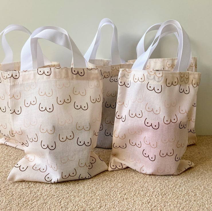 Fun booby print cream cotton themed party bags Small tote gift bags.