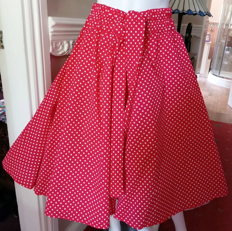 Handmade in Wales 1950s Vintage retro rockabilly full circle skirt, elasticated waist This skirt is made in a polycotton 4mm polka dot print in red and white It will fit multi sizes dues to the elasticated waist. 28" Long from top of waistband