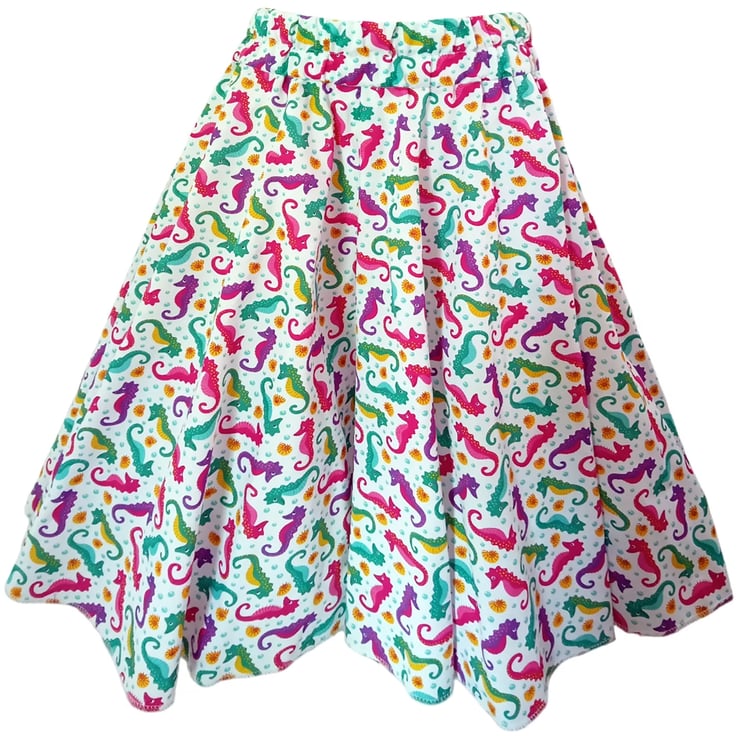 Handmade in Wales 1950s Vintage retro rockabilly full circle skirt, elasticated waist This skirt is made in a polycotton seahorse print on a white background. It will fit multi sizes dues to the elasticated waist. 28" Long from top of waistband