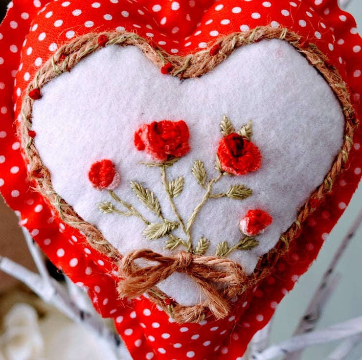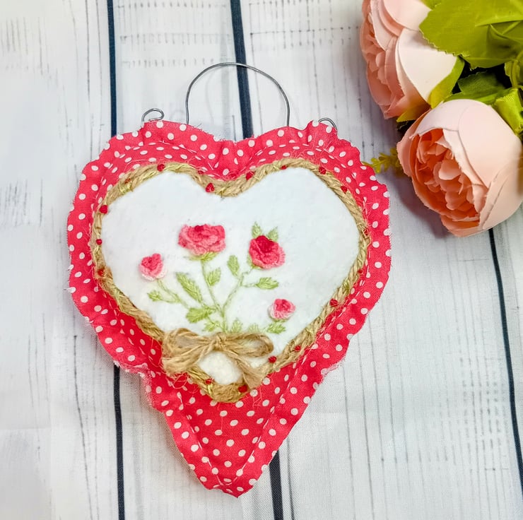 Add a touch of charm and elegance to your home with this beautifully hand embroidered heart decoration.